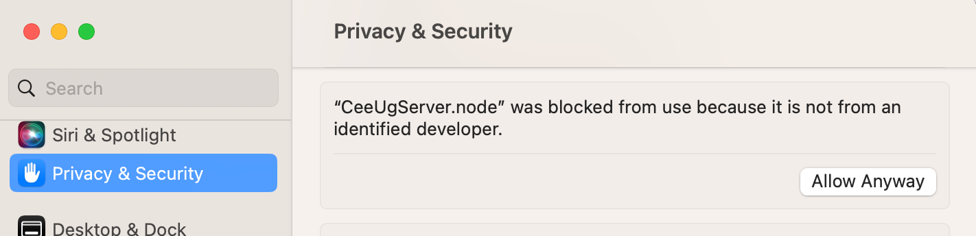Note: You might get an error saying the CeeUgServer.node cannot be opened. If so, go to Privacy and Security and allow it.