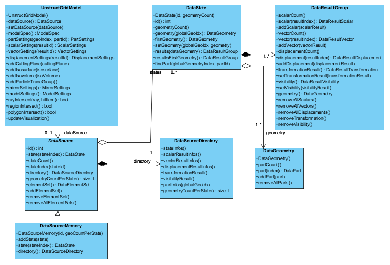 The data source contains a collection of all states for one analysis. Each state groups together geometries and results for one time step, load case, frequency etc. The memory data source class provides a way for the user to manually create the model “by hand”.