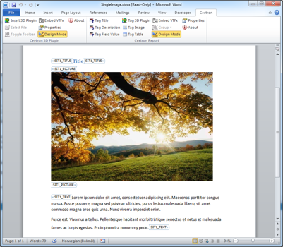 Generic tags are used when you just specify the tag type without a snapshot index. This means that this part of the document should be duplicated ‘number of snapshots’ times and each duplicate will map to one snapshot in the repository. For MS Word, generic tags must be within a Group Content Control. This group will then be duplicated so that there is one copy for each snapshot in the repository. For MS PowerPoint, if a generic tag is found, the entire slide will be duplicated. You will get one copy of the slide for each snapshot in the repository. The syntax of a generic tag is the same as for a static tag, just without the index. For instance, “SIT_PICTURE”. A scenario where this is useful can be a report where you want some descriptive pages at the start with certain images or models from the repository and a reference list just showing the title and picture for all snapshot at the end.