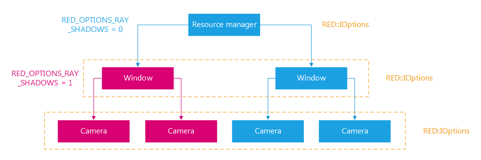 If we change for example the value of “RED::OPTIONS_RAY_SHADOWS” at the window option level, then all cameras linked to that window will inherit of the value defined at the window level and the window no longer inherits from the default value stored in the resource manager. If a window child camera also changes that option value, it’ll remove the inheritance link and override the value set at the window level.