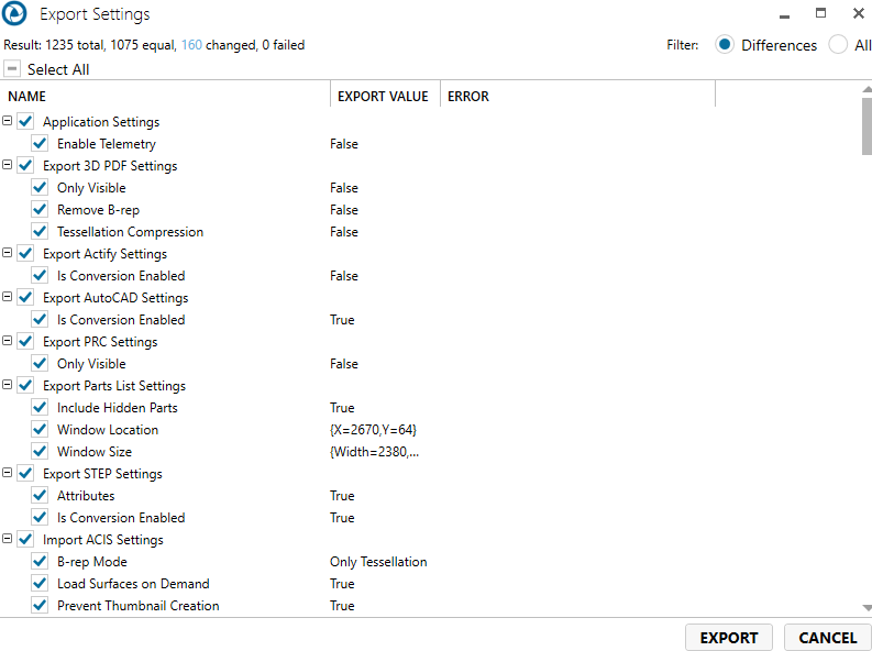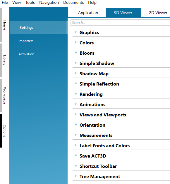 You can save your current Application, 3D Viewer, and 2D Viewer settings to an XML file. Another user can then load this XML file to use the same Application, 2D, and 3D Viewer settings in his/her SpinFire environment. This can be useful if a file requires specific settings in order to be viewed properly or if an organization needs to ensure that all users are using the same settings.