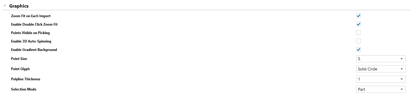 Zoom-fit on Each Import - When a file is opened, SpinFire automatically pans and zooms to provide a close-up view of the document contents while still fitting the contents entirely within the Viewport. If the checkbox is cleared, the view will reflect the camera position of the original CAD file.