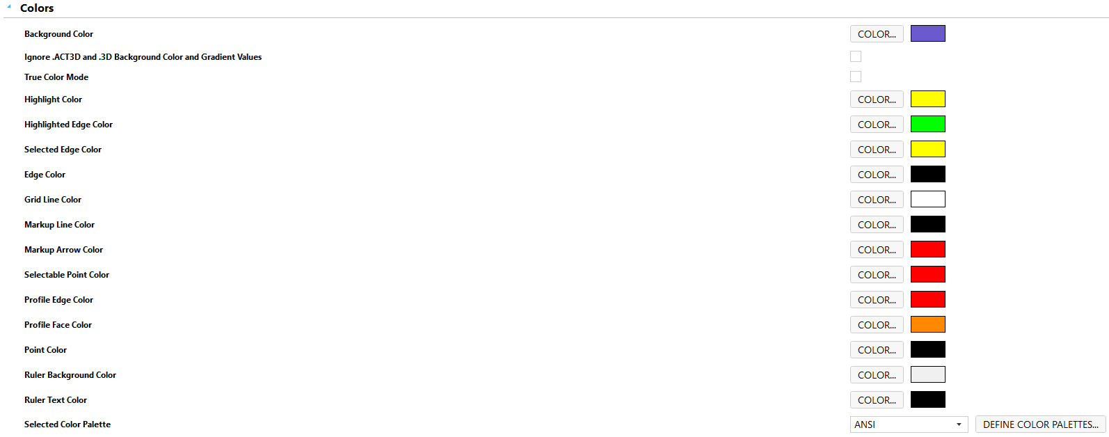Background, Highlight, Highlighted Edge, Selected Edge, Edge, Grid Line, Markup Line, Markup Arrow, Selectable Point, Profile Edge, Profile Face, Point, Ruler Background, and Ruler Text Color colors - Click the respective Color… button to choose a default color for scene elements.