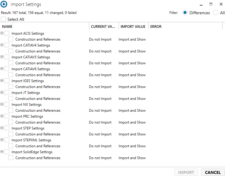 The Import Settings dialog box appears, which lists existing and new setting values side by side. If the new settings are acceptable, click the OK button. (Note the Filter radio buttons: You can choose to view only the differences between the existing and new settings to more easily compare the values.)