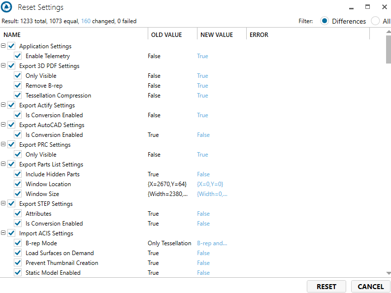 The Reset Settings dialog box appears, which lists existing and original default setting values side by side. Click the OK button to restore the original defaults. (Note the Filter radio buttons: You can choose to view only the differences between the existing and new settings to more easily compare values.