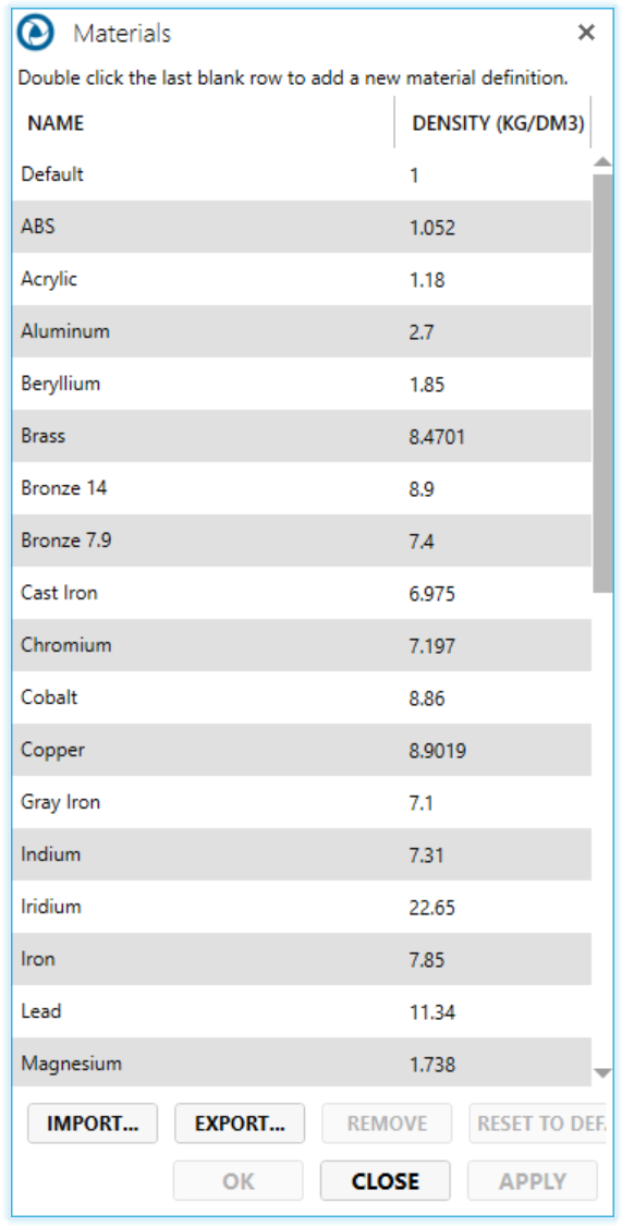 SpinFire Insight uses materials and the density of materials to calculate the weight of a 3D model. A list of materials with pre-defined densities populate SpinFire Insight by default. These can be changed, added, and removed.