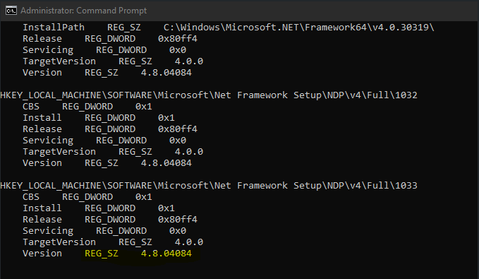 - To check the version of .NET currently installed, run this command in Command Prompt while as Administrator :reg query “HKLM\SOFTWARE\Microsoft\Net Framework Setup\NDP\v4” /sThe last lines which have “Version REG_SZ” will show what version of .NET is currently installed on the machine.