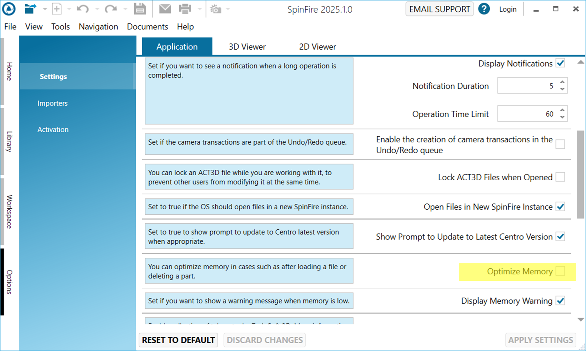 Turn on “Optimize Memory” Setting found under Settings > Application. Then Click Apply Settings and reopen your CAD Model to see the change.