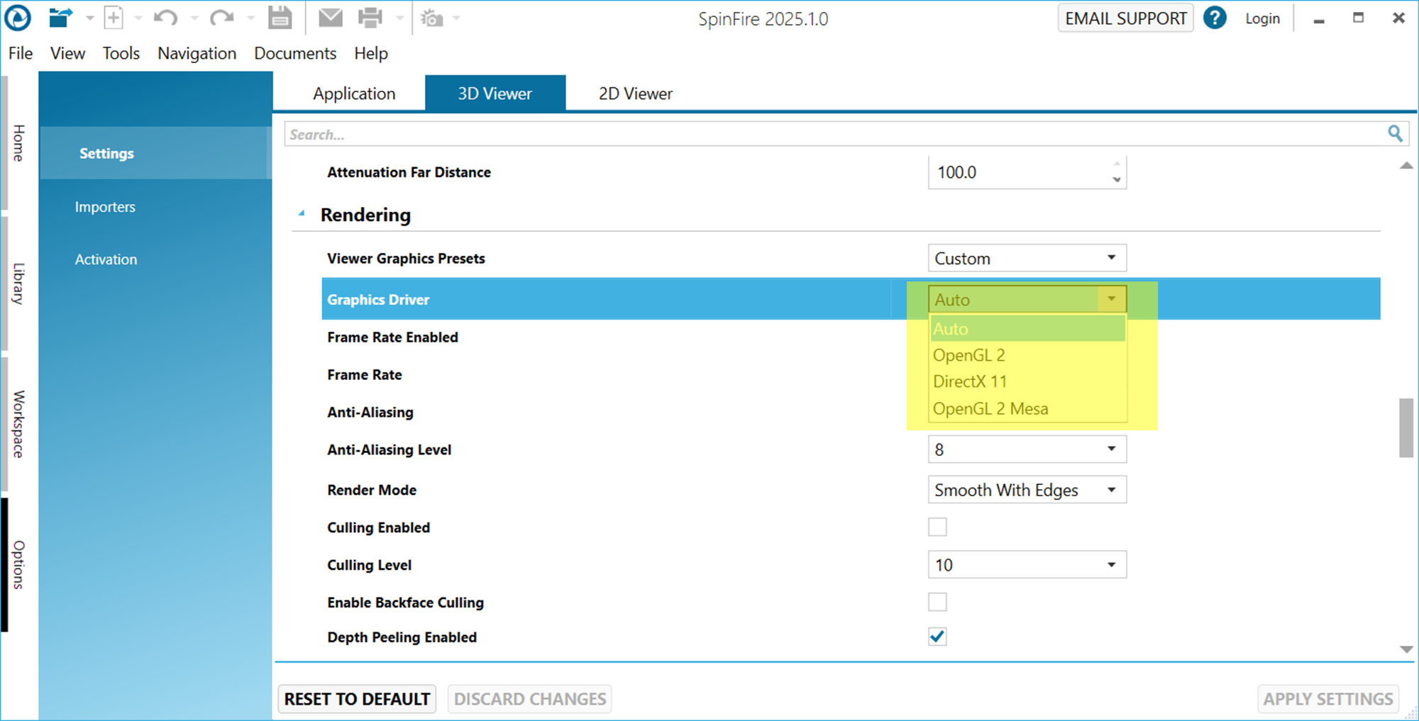 Change DirectX11 to OpenGL 2 and click Apply Settings bottom right. Then reopen your CAD Model to see the change.