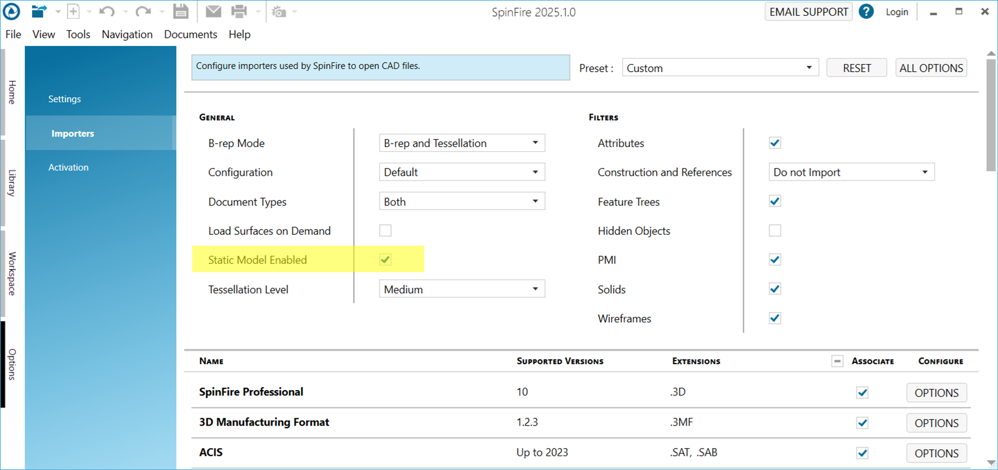 Static Model enables better optimization of the assembly tree after the file has finished loading. Turn on “Static Model Enabled” under Options > Importers. Then reopen your CAD Model to see the change.