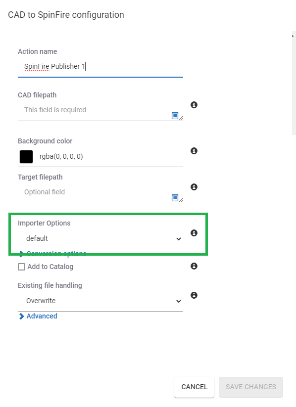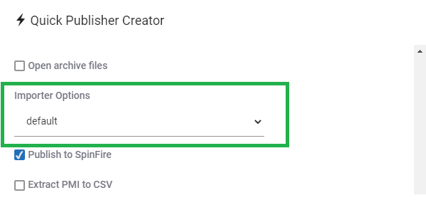 The Importer Options field also appears on the Generate window from the SpinFire Manage Catalog part view page.