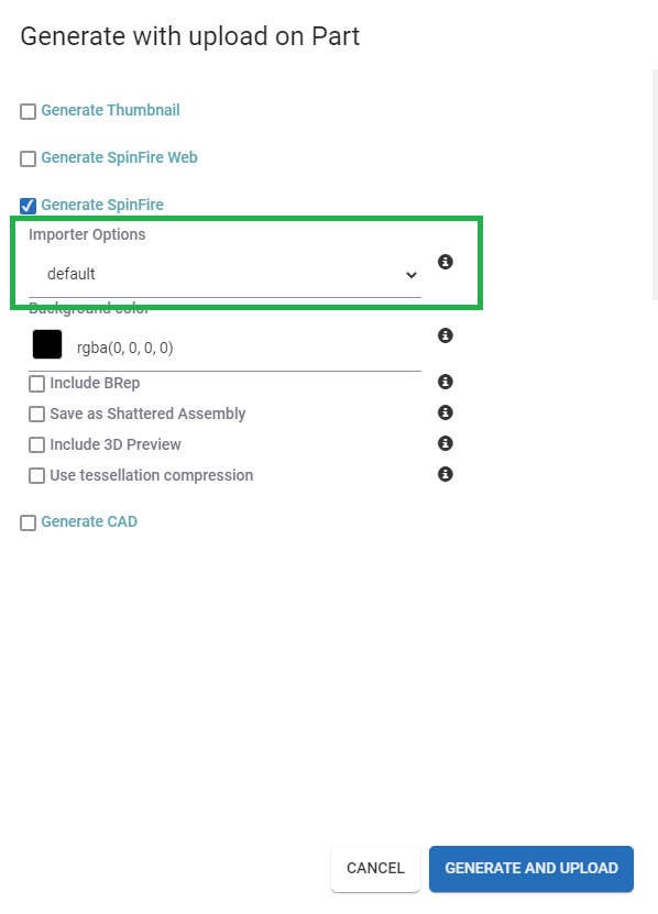 If a CAD file was uploaded from a pipeline, the Generate options will inherit the importer options used from the pipeline.
