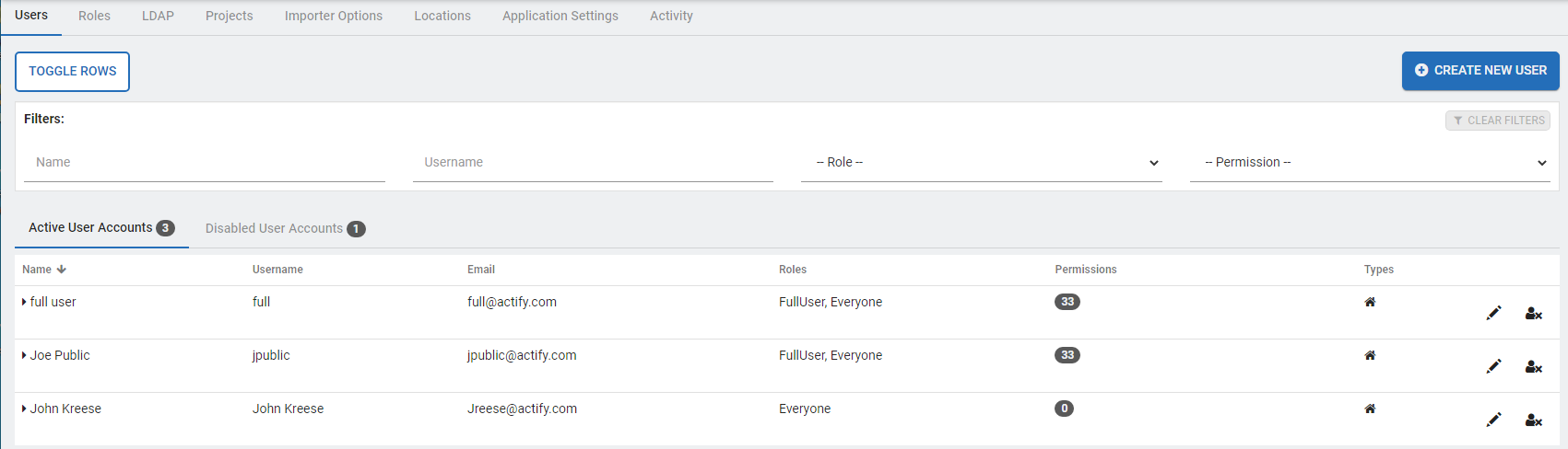 Use the Toggle Rows button to reveal user details within the list and filter the list with the filters controls.