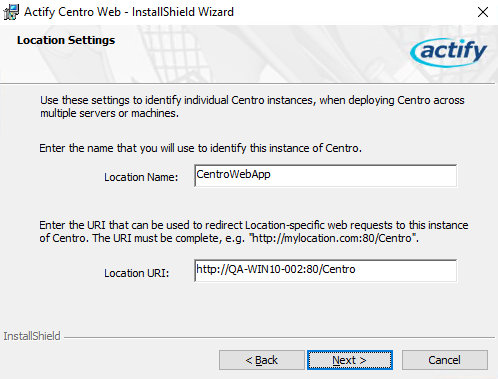 7. Set the Location name for this SpinFire Manage instance and the Location URI (how your user base will access the SpinFire Manage instance. Note: Direct IP addresses should not be used).