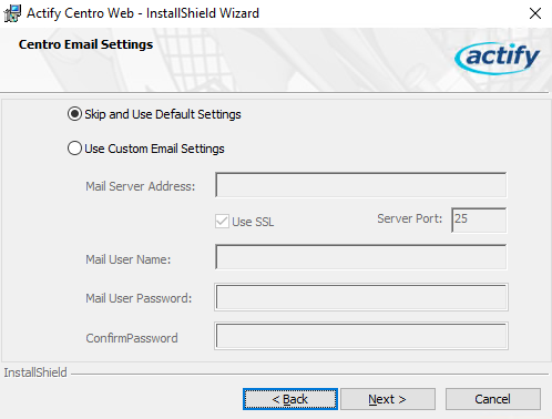 Enter email server information or choose to skip. Click Next.