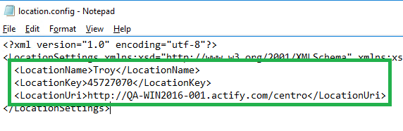 Copy the information from the C:\inetpub\wwwroot\Centro\Configuration\location.config file. Each values is specific to your configuraion. The important information to note are: