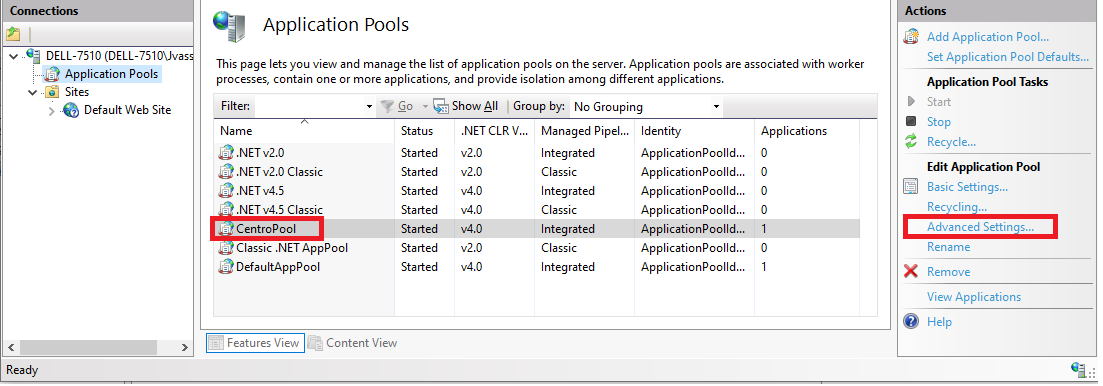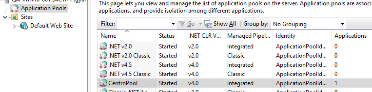 Now, back in the Application Pool list, select CentroPool and “Recycle” for the changes to take affect.