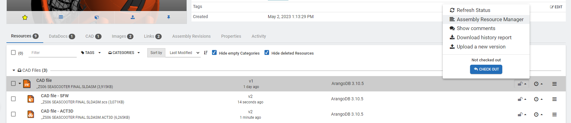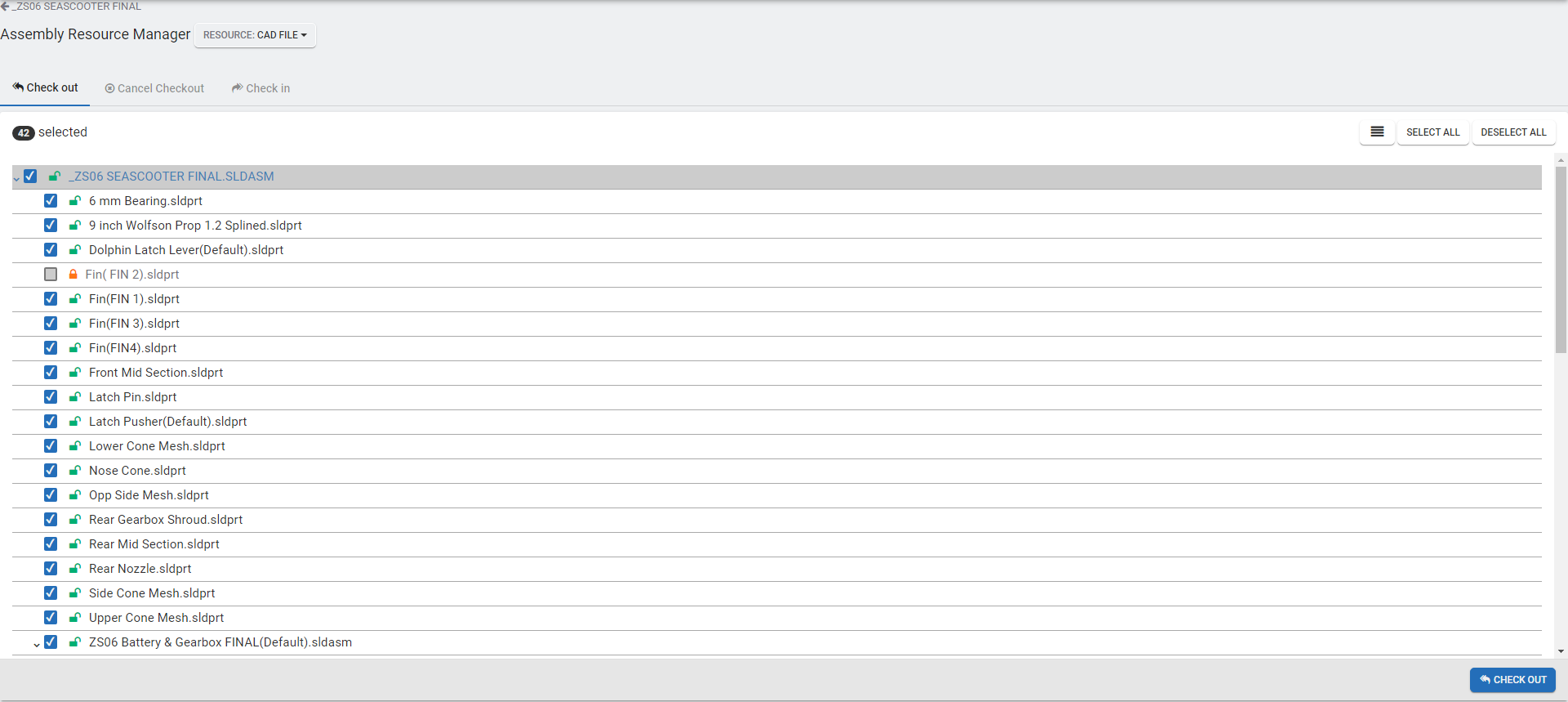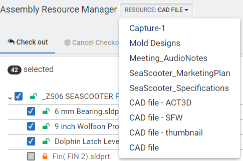 The Assembly Resource Manager relieves a user from the tediousness from checking out and checking in large number of resources one at a time. The Assembly Resource Manager allows bulk check outs and check ins with a vision on entire assemblies at one time.