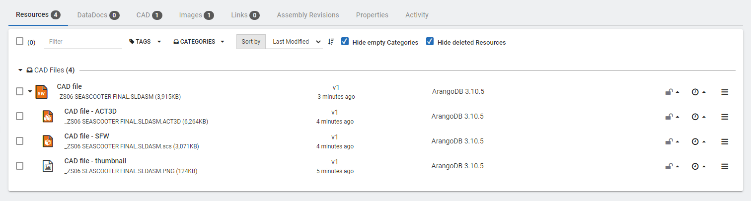 The resources tab lists all files contained within the catalog part. SpinFire Manage 7 automatically determines the type of file based on the file extension.