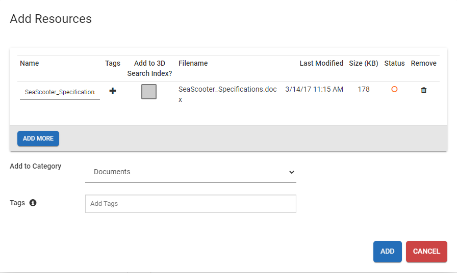 Click Add More to upload additional files or click Add to upload the current list of files.The status icon indicates if files have been successfully uploaded.![]()