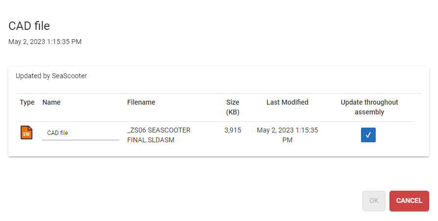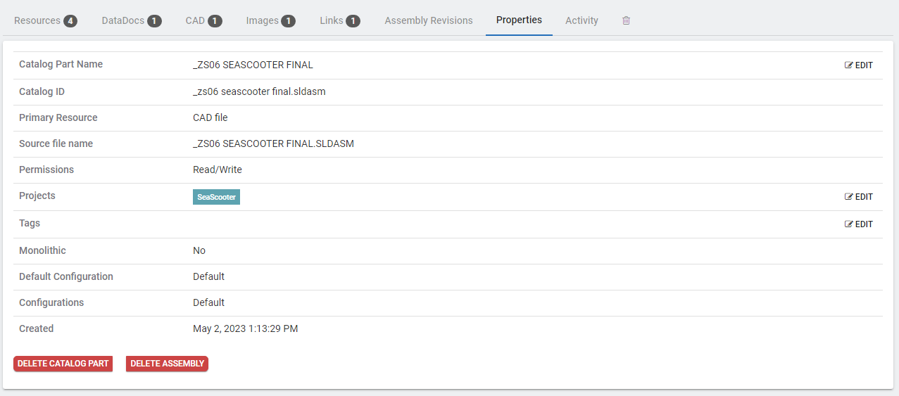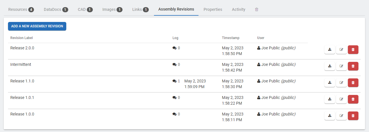 The Assembly Revisions tab enables you to label a snapshot in time of an assembly and all its parts. Use this tab to view the list of revisions. See Assembly Revisions.