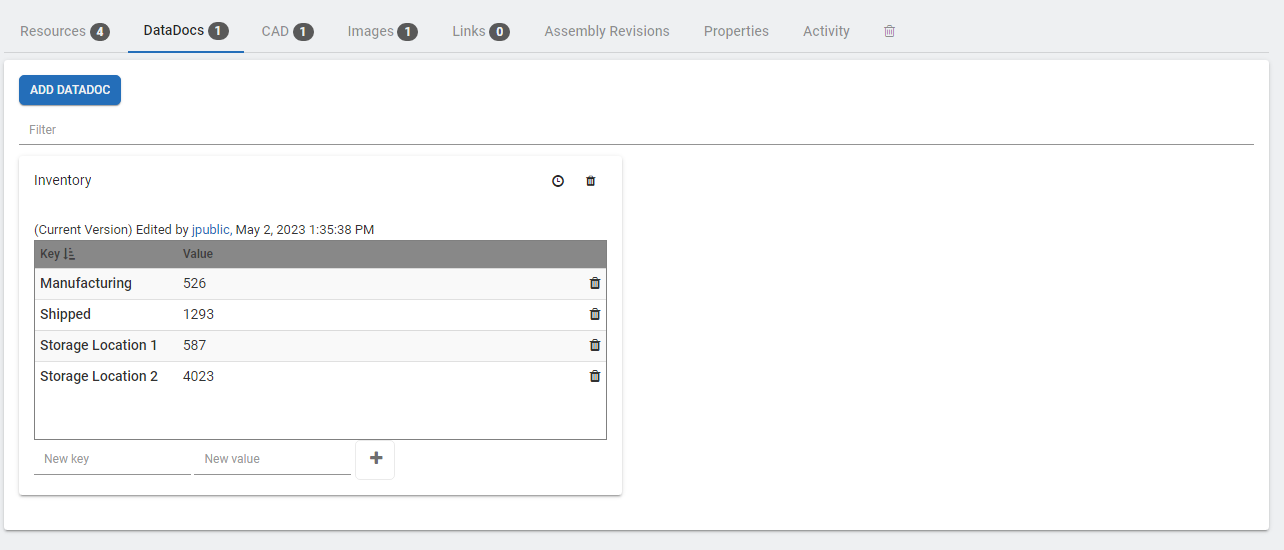 The DataDocs tab shows additional data associated with the catalog part. This data can be added via a pipeline action or manually.