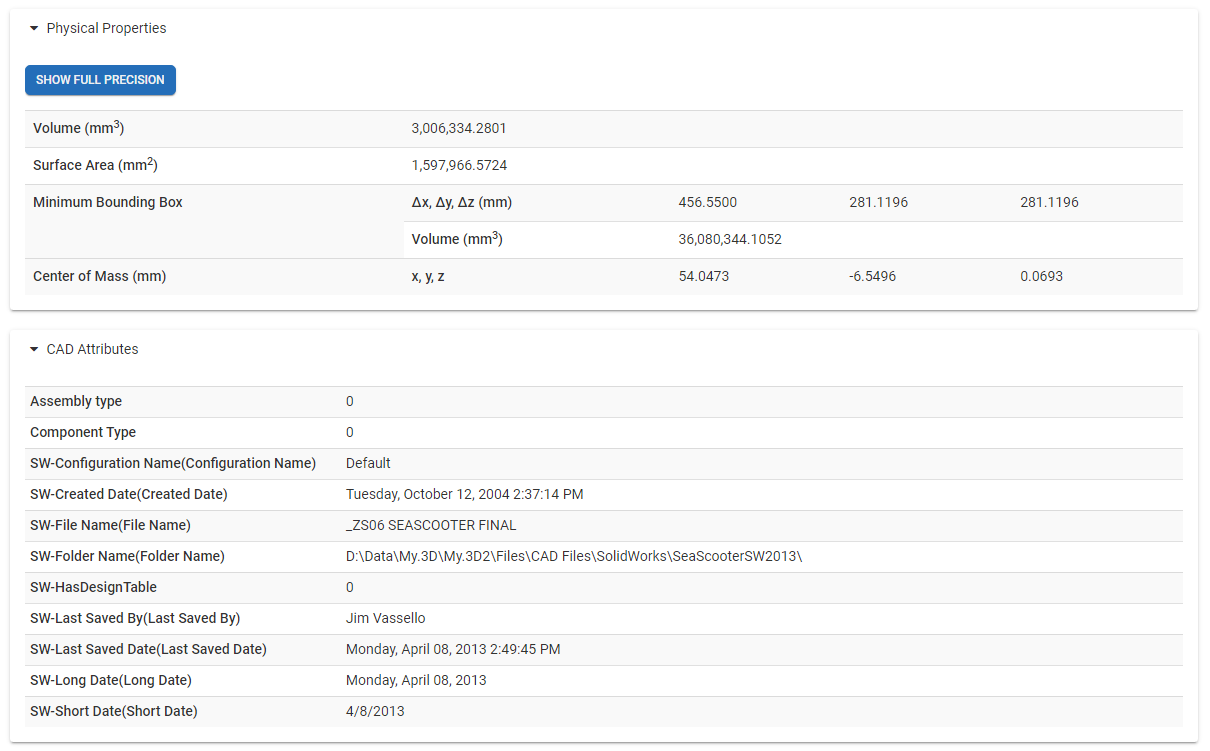 Reads the physical peroperties (volume, surface area, minimum bounding box, and center of mass) from the CAD file and displays it on the CAD tab.