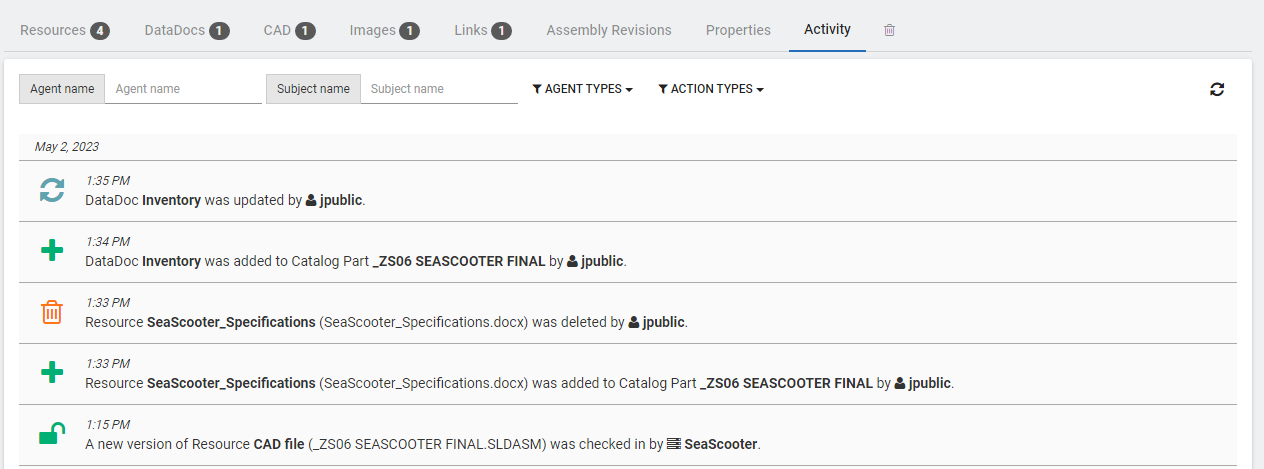 The Activity tab documents changes and actions performed on the Catalog part. See Catalog Part Activity for more information.