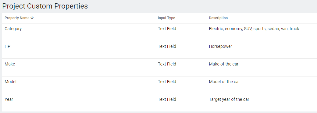 In this simple example, we’ve configured project custom properties and a property set to some vehicle attributes to associate with projects.