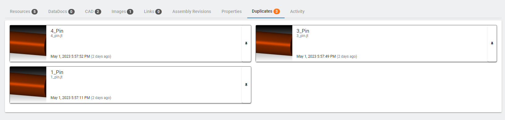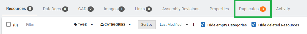 If there are duplicates, a Duplicates tab will appear on the Catalog part page. Click on the Duplicates tab.