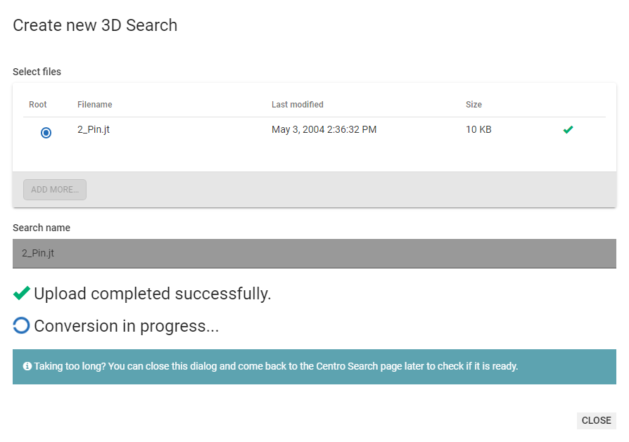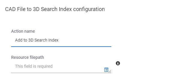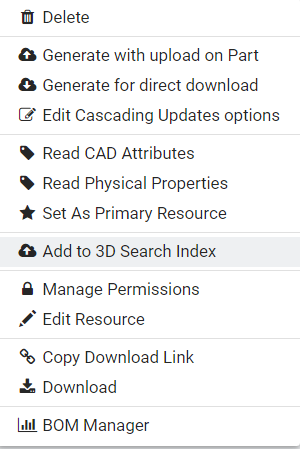 CAD files are the only resources that can be added to the 3D search index. There are two opportunities to manually add a CAD file to the 3D search index.