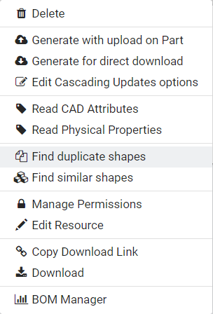 Click on the action menu and select Find similar shapes for the CAD file resource.