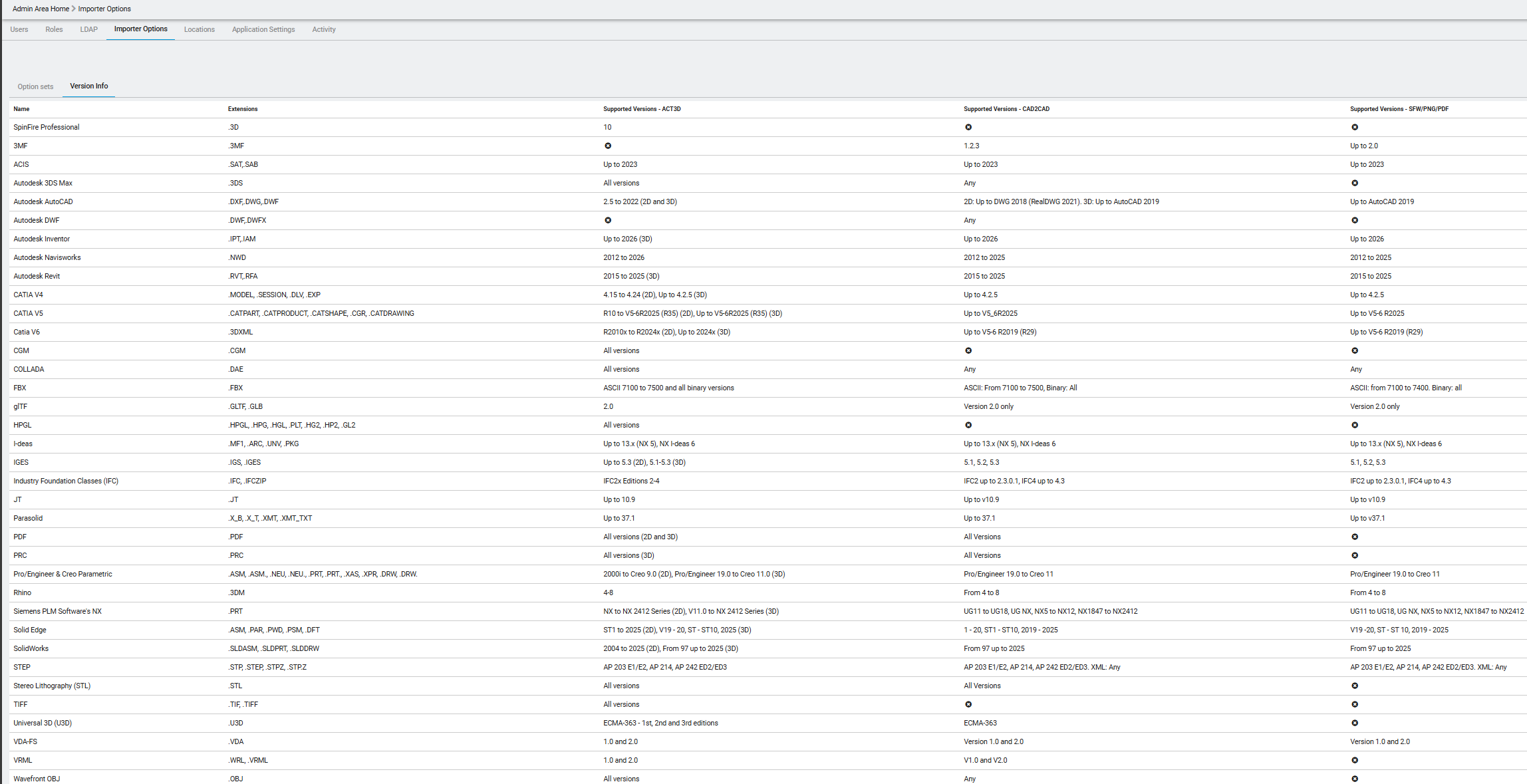 For a list of Importers available in SpinFire Publish, go to the Admin Area then Importer Options and under Version Info.