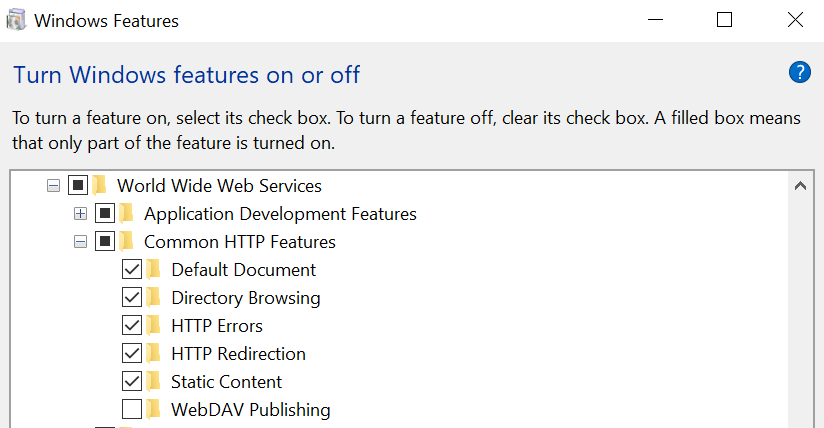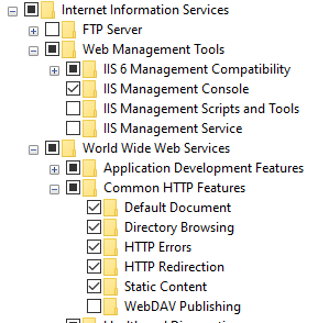 Check and then Expand Internet Information Services > World Wide Web Services > Common HTTP Features.![]()