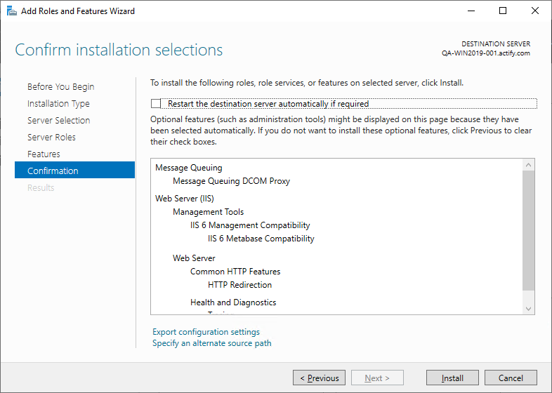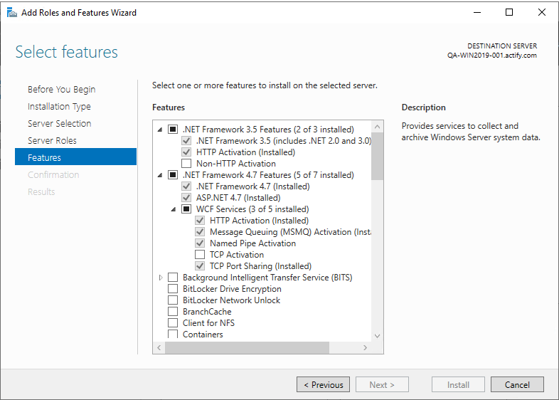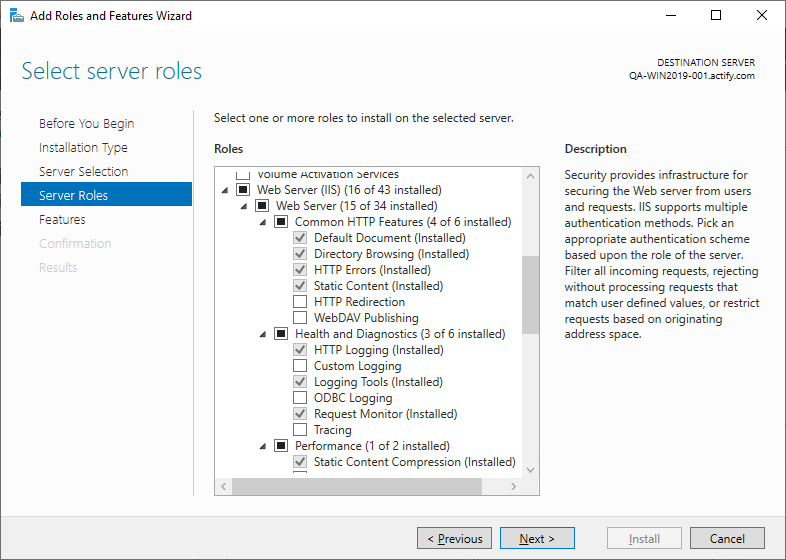 For Windows Server 2016, add the roles and features as described for the 2012 R2 section, except for .Net 3.5. You will have to install the other Roles and Features first, do a reboot, then install .Net 3.5.
