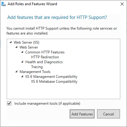 Also make sure the Web Server → Management Tools → Management Service is installed