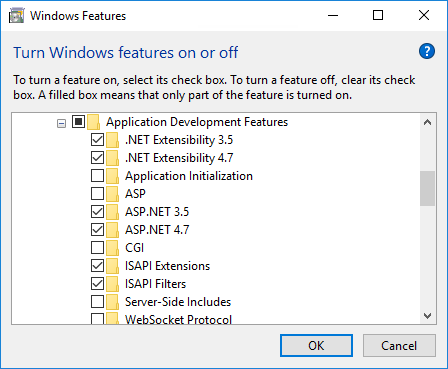Launch Control Panel. Click Get Programs. Click Turn Windows features on or off. Expand Internet Information Services > World Wide Web Services > Application Development Features. Check .NET Extensibility 3.5. Check .NET Extensibility 4.x. Check ASP.NET 3.5. Check ASP.NET 4.x. Check ISAPI Extensions. Check ISAPI Filters.![]()